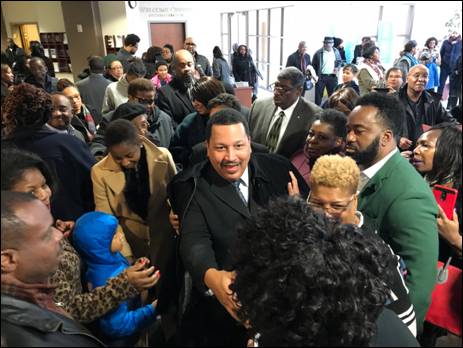 Dr. Lance D. Watson, Senior pastor of St. Paul’s Baptist Church greets Church Members after New Year’s Eve Service in the main Sanctuary
